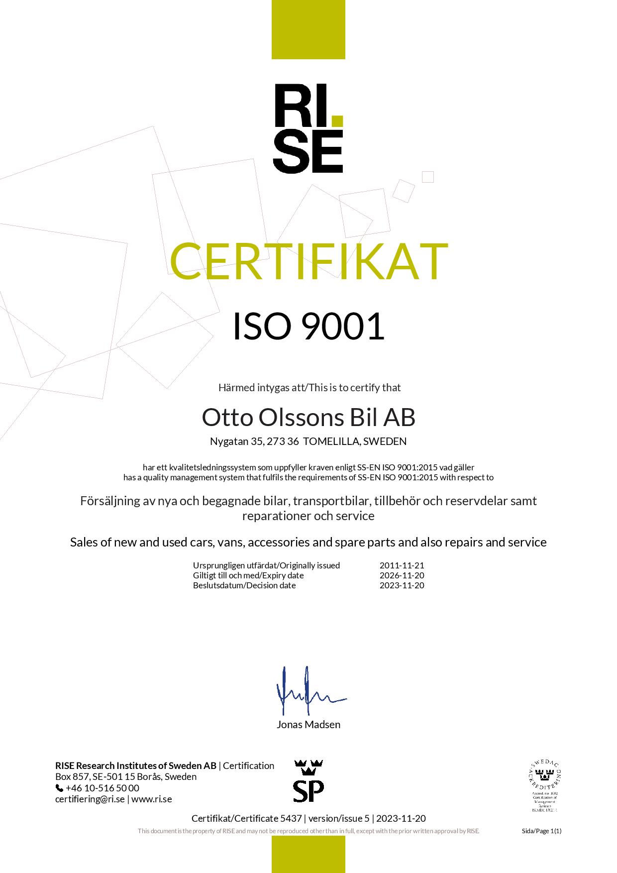 Kvalitetspolicy för Otto Olssons Bil AB